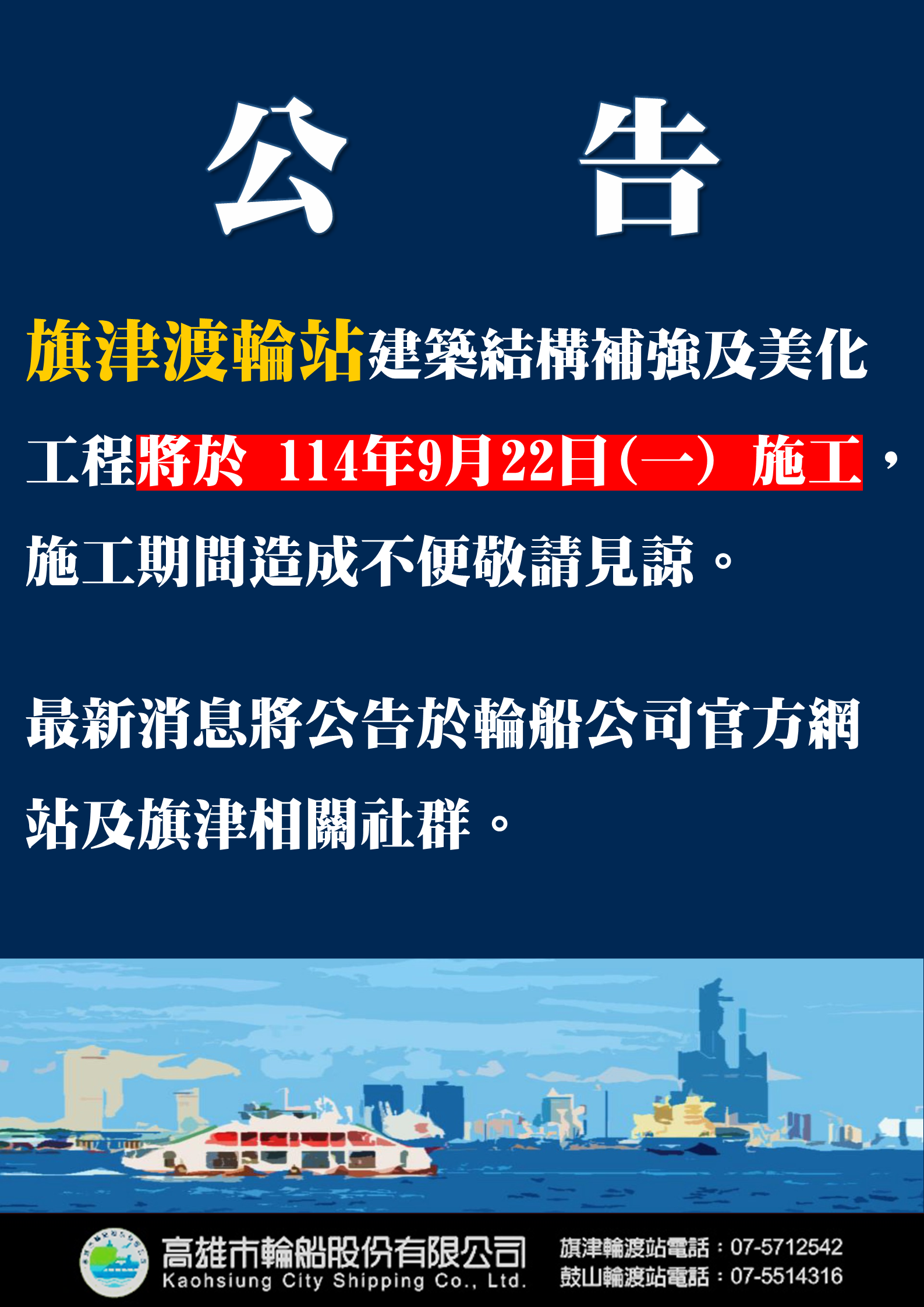[公告]旗津輪渡站 建築結構補強及美化工程114年9月22日(ㄧ)施工期間造成不便敬請見諒。